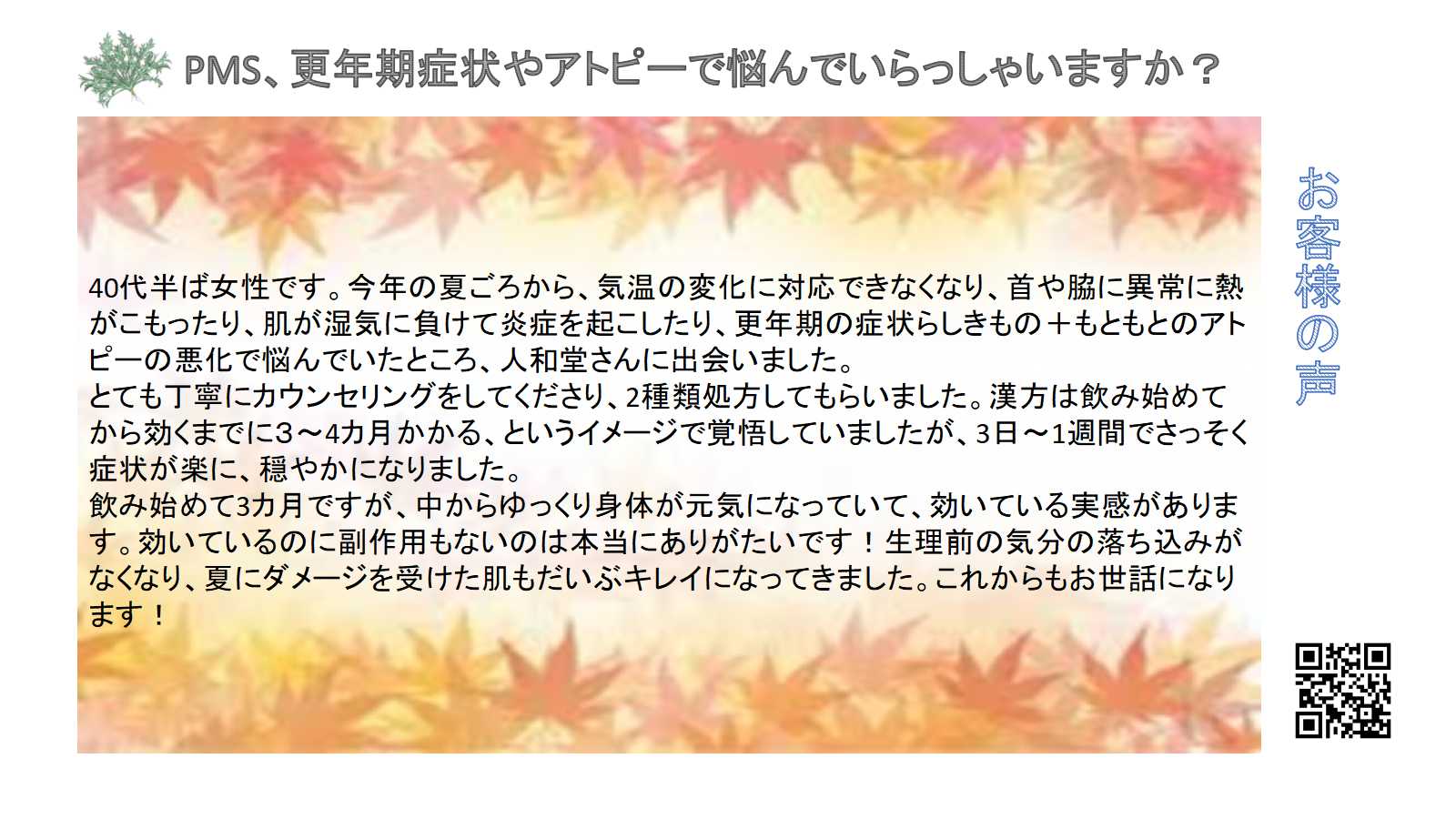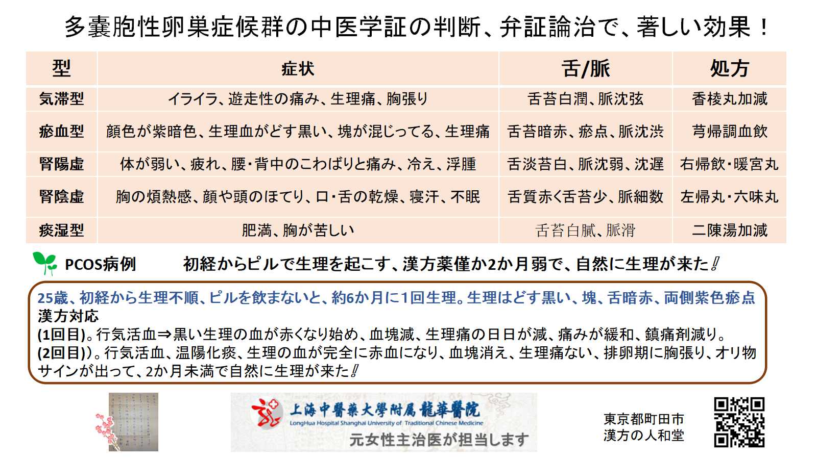 初経からピルで生理を起こす、漢方薬僅か2か月弱で、自然に生理が来た?25歳のAさん、初経から生理不順、ピルを飲まないと、約6か月に1回生理。生理はどす黒い、塊、舌暗赤、両側紫色瘀点。 漢方対応 (1回目)。行気活血⇒黒い生理の血が赤くなり始め、血塊減、生理痛の日日が減、痛みが緩和、鎮痛剤減り。 (2回目)。行気活血、温陽化痰、生理の血が完全に赤血になり、血塊消え、生理痛ない、排卵期に胸張り、オリ物サインが出って、2か月未満で自然に生理が来た? 2022.3.11 |