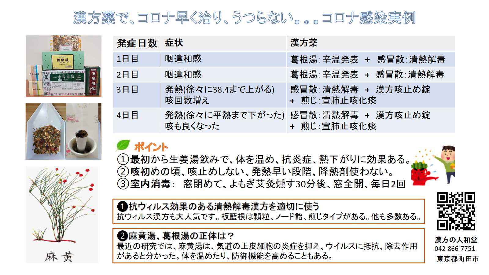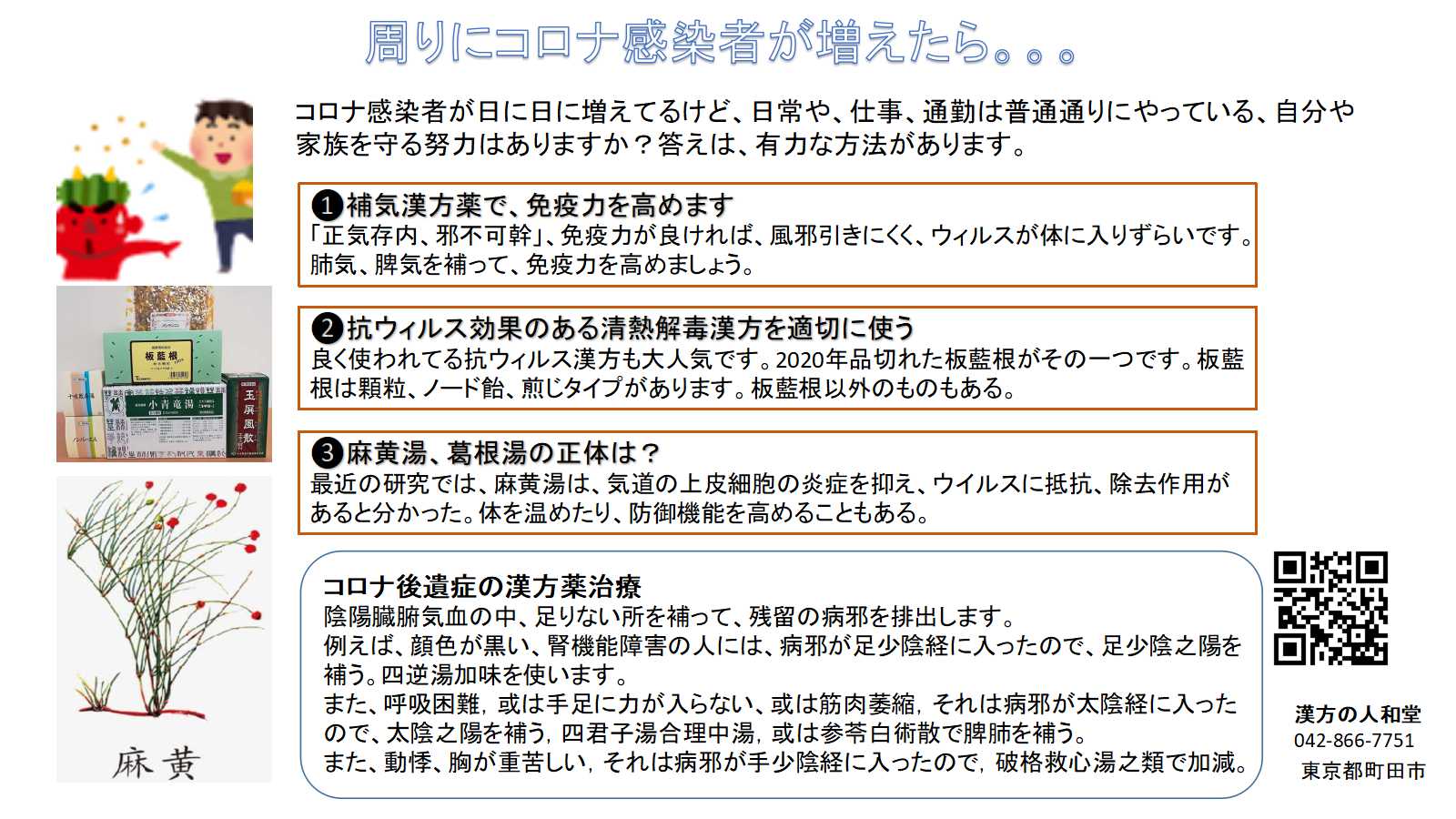 周りにコロナ感染者が出たら。。。(1)。補気漢方薬で、免疫力を高めます 「正気存内、邪不可幹」、免疫力が良ければ、風邪引きにくく、ウィルスが体に入りずらいです。肺気、脾気を補って、免疫力を高めましょう。 (2)。抗ウィルス効果のある清熱解毒漢方を適切に使う 良く使われてる抗ウィルス漢方も大人気です。2020年品切れた板藍根がその一つです。板藍根は顆粒、ノード飴、煎じタイプがあります。板藍根以外のものもある。 (3)。麻黄湯、葛根湯の正体は? 最近の研究では、麻黄湯は、気道の上皮細胞の炎症を抑え、ウイルスに抵抗、除去作用があると分かった。体を温めたり、防御機能を高めることもある。 煎じ薬、シロップ、顆粒剤、丸薬、錠剤、粉薬などがあります。 2022.2.5 |