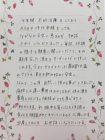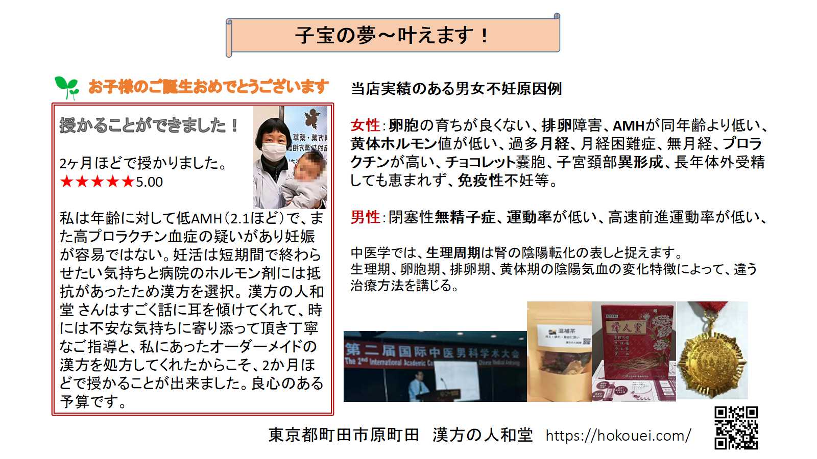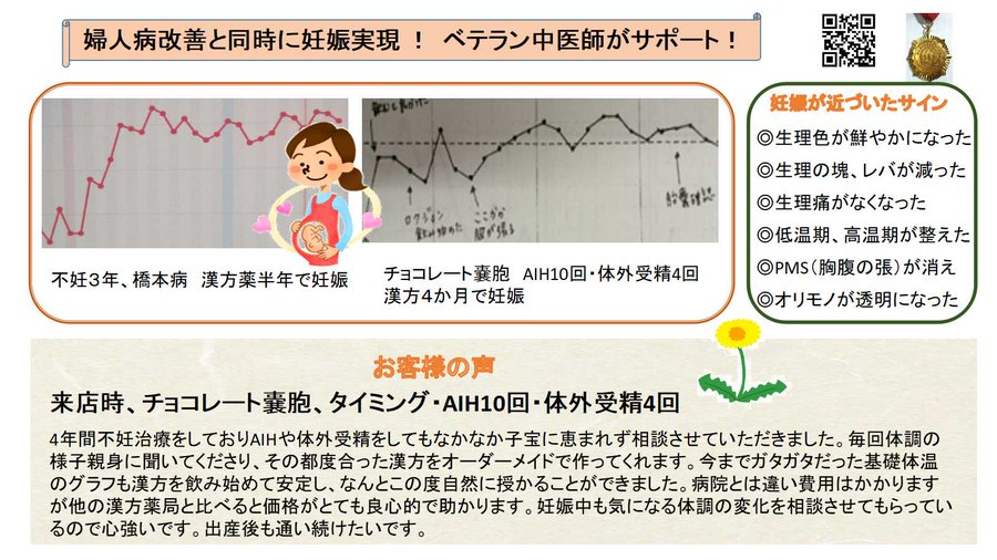 人工/体外受精4年後、漢方薬のみ4ヶ月で自然妊娠町田市静かな一角にある漢方の店に、号泣していた女性がいます、今月何人目かな? 女性がご主人さんと一緒にこの店を訪ねて来たのが妊活4年目の時でした。それまでは、チョコレート嚢胞摘除術後、都内大きなレディースクリニックに通っていって、人工授精、体外授精を十数回やりました。妊娠検査薬陽性が2回あったけど、すぐ化学流産してしまった。 この中医学専門の店で、4が月間オーダーメイド漢方薬を飲んで、体の不調、生理の不調が治って、基礎体温曲線も迅速に良くなってきた! 本人は、これから、またクリニックに戻って、体外受精、凍結胚移植を再開予定でした。と、店に相談して来たその日、基礎体温曲線がは非常に良くて、念のため測定したら、妊娠判定陽性!!! 驚き、こんなに濃い2本の線が初めて!!! 速すぎる妊娠、感激、涙が止まらない、だって、ご主人さんが50才近く、頑張る予定はこの2年しかない。おめでとうございます! 多く不妊症の女性が優しい漢方薬で加速妊娠、社会にも意味があるね。 ●詳しくは⇒喜びの声 2021.6.26 |