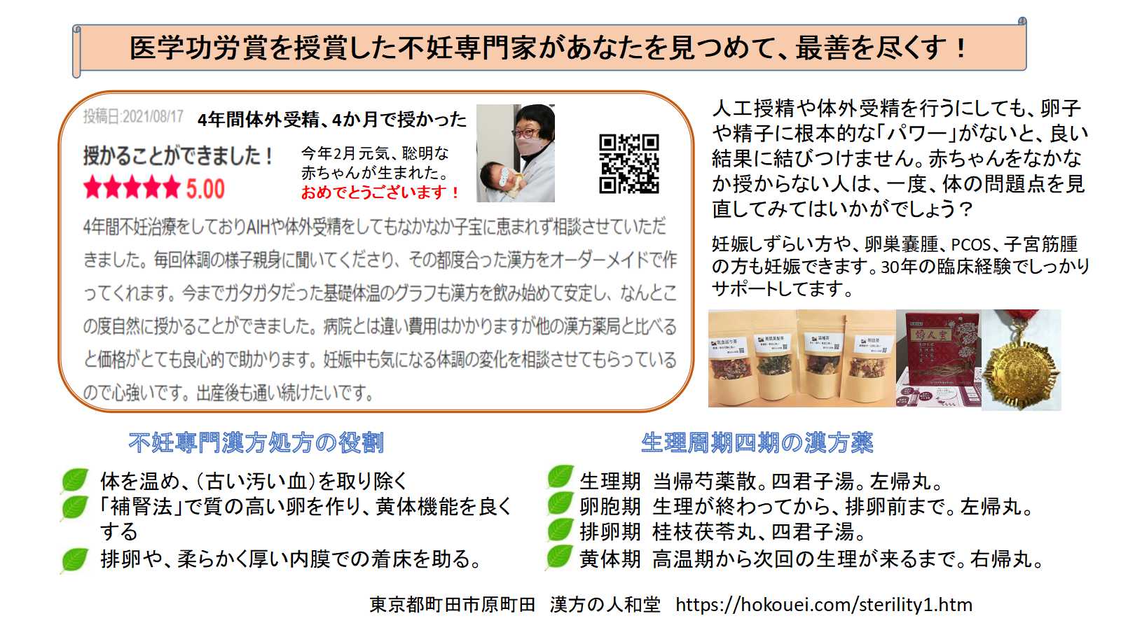 不妊専門漢方処方の役割(1).体を温め、(古い汚い血)を取り除く(2).「補腎法」で質の高い卵子を作り、黄体機能を良くする, 排卵や、柔らかく厚い内膜での着床を助ける。 2022.4.19 |