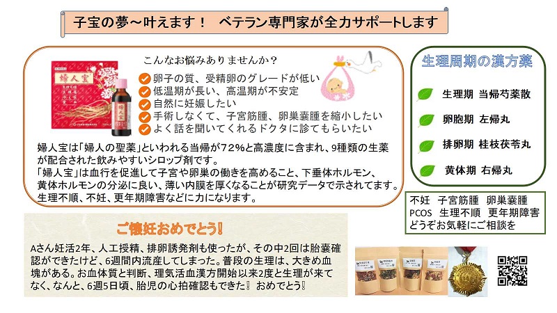 子宝の夢〜叶えます!当店実績のある男女不妊原因例女性 卵胞の育ちが良くない 排卵障害、AMHが同年齢より低い 黄体ホルモン値が低い 過多月経、月経困難症、無月経 プロラクチンが高い チョコレット嚢胞 子宮頚部異形成 長年体外受精恵しても恵まれず 免疫性不妊等 男性 無精子症 運動率が低い 煎じ薬、シロップ、顆粒剤、丸薬、錠剤、粉薬などがあります。 2022.1.4 |