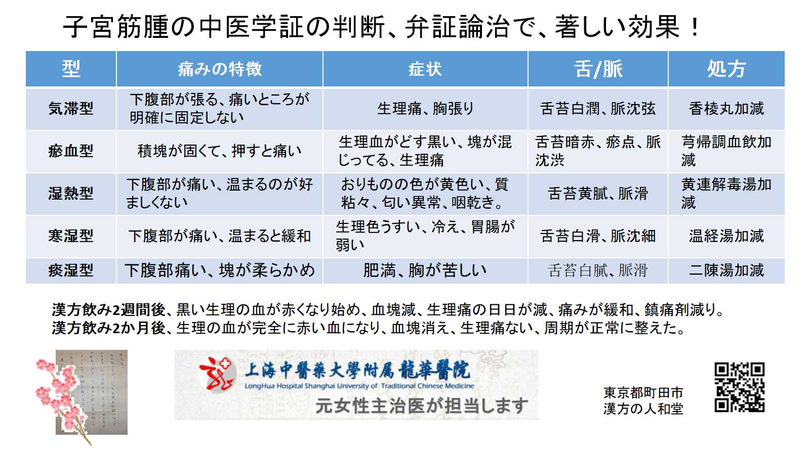 子宮筋腫の中医学証の判断弁証論治子宮筋腫は気滞型、瘀血型、湿熱型、寒湿型、痰湿型がある、 痛みの特徴や症状、脈が違います、証を正しく判断の上、正しい処方を使う。 漢方飲み2週間後、黒い生理の血が赤くなり始め、血塊減、生理痛の日日が減、痛みが緩和、鎮痛剤減り。 漢方飲み2か月後、生理の血が完全に赤い血になり、血塊消え、生理痛ない、周期が正常に整えた。 煎じ薬、シロップ、顆粒剤、丸薬、錠剤、粉薬などがあります。 2021.12.20 |