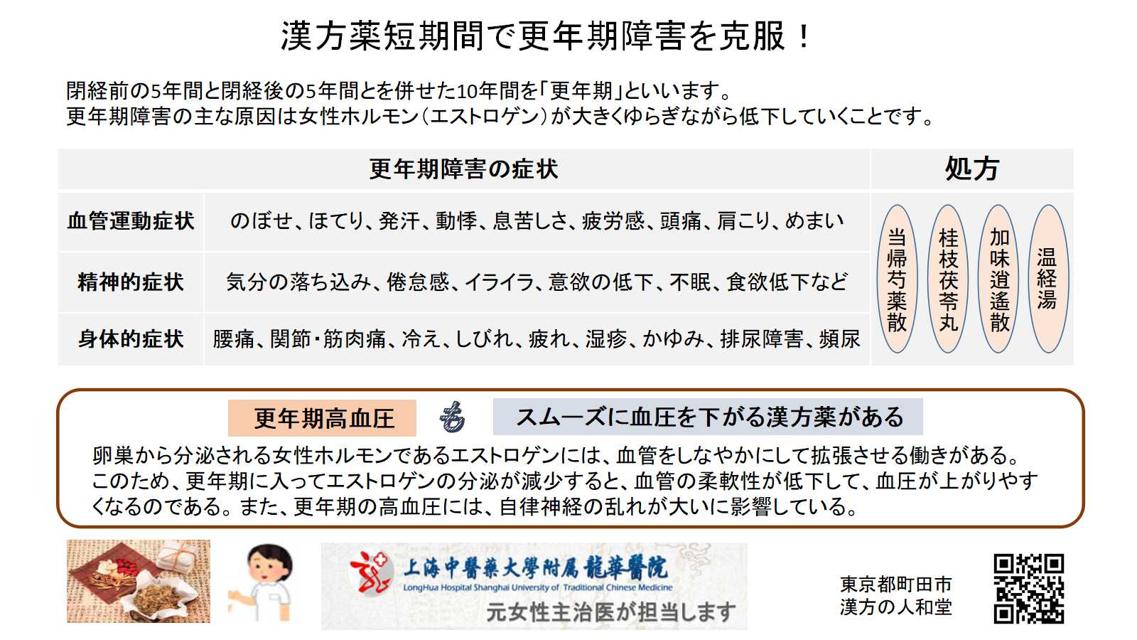 漢方薬短期間で更年期障害を克服!?閉経前の5年間と閉経後の5年間とを併せた10年間を「更年期」といいます。 更年期障害の主な原因は女性ホルモン(エストロゲン)が大きくゆらぎながら低下していくことです。 のぼせ、ほてり、発汗、動悸、息苦しさ、疲労感、頭痛、肩こり、めまい等の血管運動症状や、関節、筋肉痛、冷え、しびれ、疲れ、排尿障害、頻尿等身体症状が出ます。 卵巣から分泌される女性ホルモンであるエストロゲンには、血管をしなやかにして拡張させる働きがある。 このため、更年期に入ってエストロゲンの分泌が減少すると、血管の柔軟性が低下して、血圧が上がりやすくなるのである。 また、更年期の高血圧には、自律神経の乱れが大いに影響している。 どんな症状も、漢方薬をうまく選べば、スムーズに改善できます。 2022.3.11 |