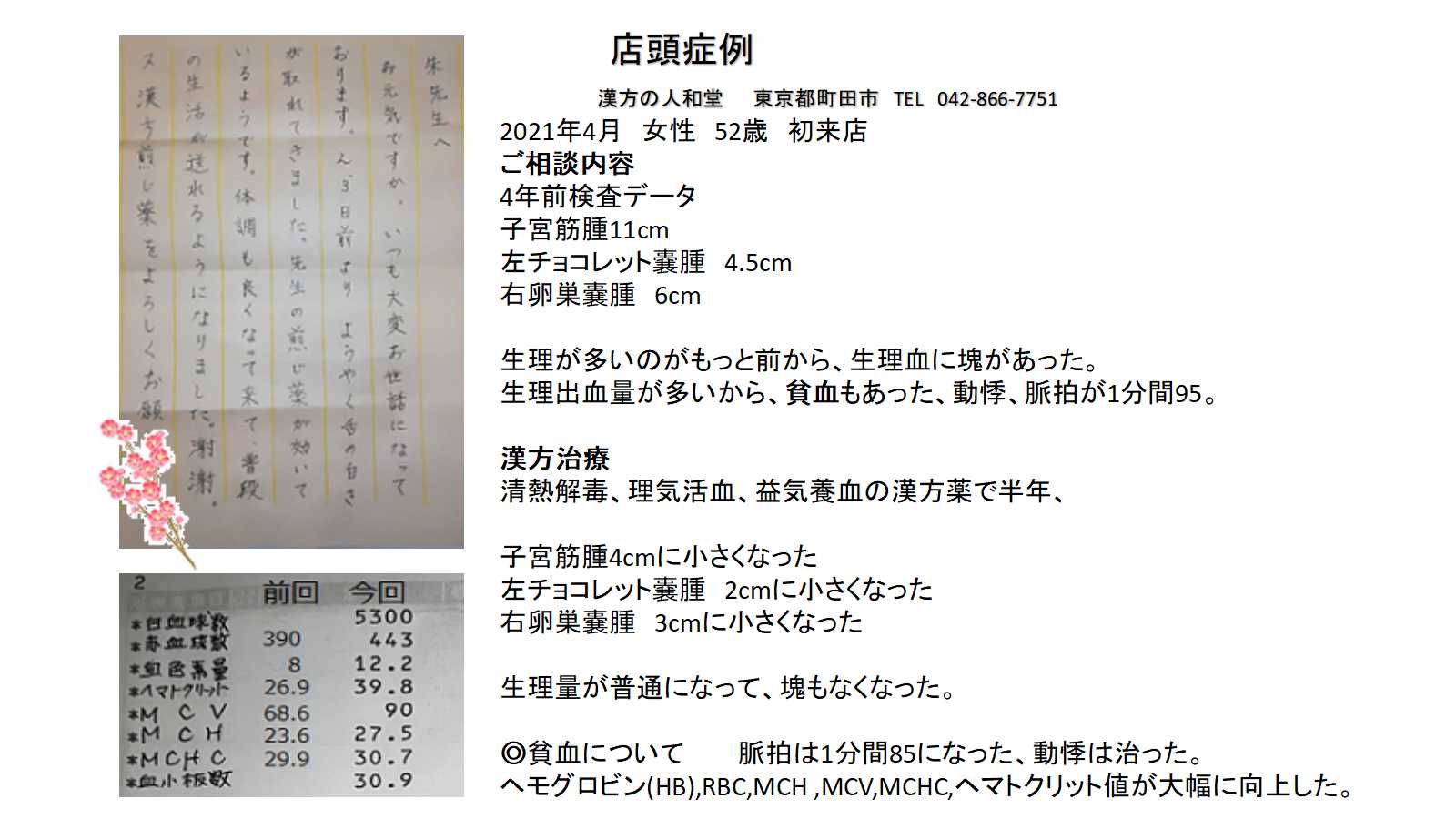 子宮筋腫、左チョコレット嚢腫、右卵巣嚢腫、貧血の店頭症例2021年4月 女性 52歳 初来店 ご相談内容 4年前検査データ 子宮筋腫11cm 左チョコレット嚢腫 4.5cm 右卵巣嚢腫 6cm 生理が多いのがもっと前から、生理血に塊があった。 生理出血量が多いから、貧血もあった、動悸、脈拍が1分間95。 漢方治療 清熱解毒、理気活血、益気養血の漢方薬で半年、 子宮筋腫4cmに小さくなった 左チョコレット嚢腫 2cmに小さくなった 右卵巣嚢腫 3cmに小さくなった 生理量が普通になって、塊もなくなった。 ◎貧血について 脈拍は1分間元の95から85になった、動悸は治った。 ヘモグロビン(HB),RBC,MCH ,MCV,MCHC,ヘマトクリット値が大幅に向上した。 煎じ薬、シロップ、顆粒剤、丸薬、錠剤、粉薬などがあります。 2021.11.15 |