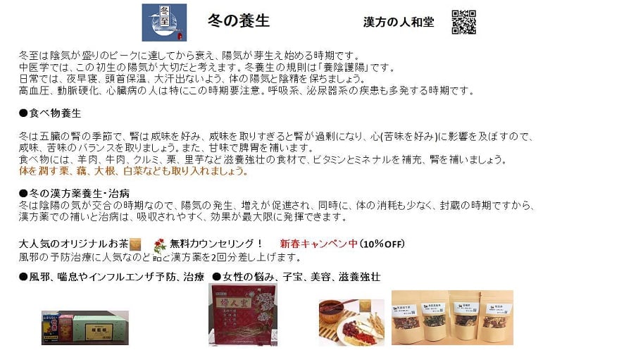 冬至〜冬の養生12/22今日は冬至です。「冬至」は非常に重要な節気で、冬至は陰気が極めて盛んになったのち衰えて、陽気が再び回復し始める時です。 冬は体が封蔵の時期で、摂取の栄養物質が一番吸収されやすい。「三九補一冬,来年无病痛」。 来年健康に過ごすため、漢方薬で養生や、持病を治るには最適です。 「冬限定 鍋用薬膳セット」、いつものお鍋に入れて、煮込むだけ。 気、血を補り、代謝を良くし、体を温め、免疫力を高める。10日分3500円。 煎じ薬、シロップ、顆粒剤、丸薬、錠剤、粉薬などがあります。 2021.12.22 |